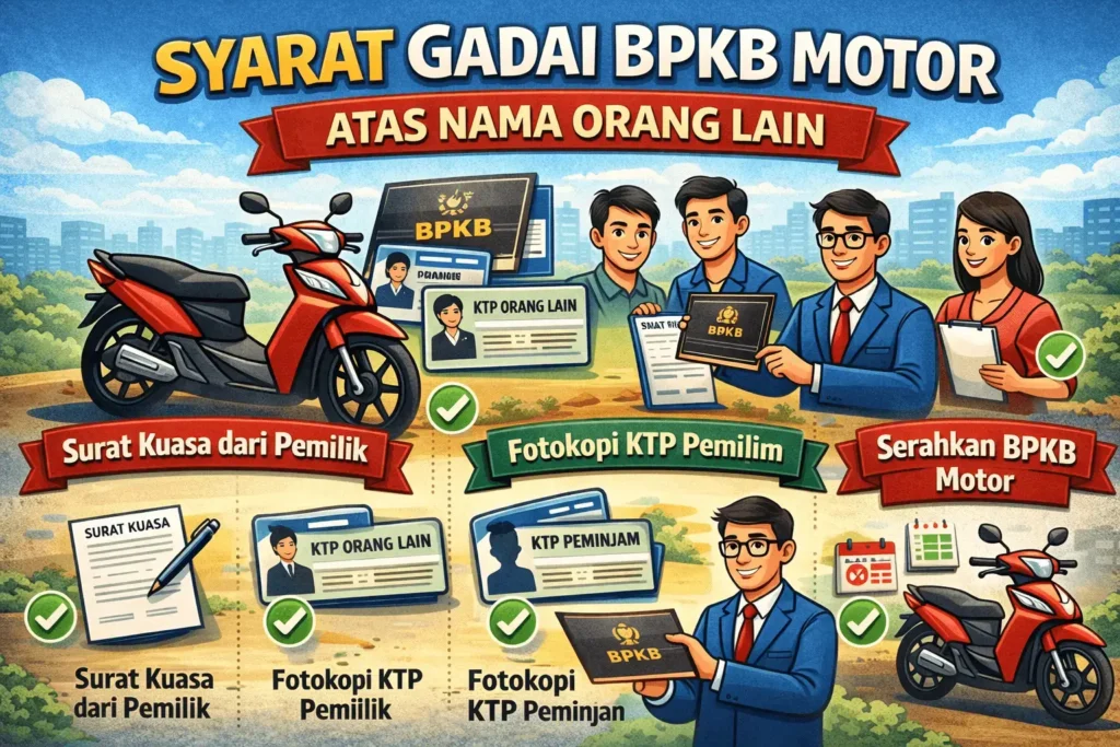Gadai BPKB motor atas nama orang lain tetap memungkinkan selama pemilik sah dilibatkan dan semua dokumen lengkap. Kunci utamanya adalah transparansi, legalitas, dan kesiapan memenuhi syarat tambahan seperti surat kuasa bermaterai.